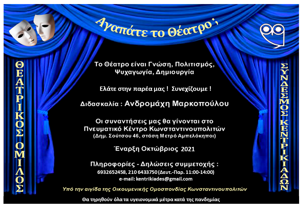 Από 15 Οκτωβρίου 2021 ξεκινούν τα μαθήματα της Θεατρικής μας Ομάδας για ανέβασμα παράστασης. Οι εγγραφές ξεκίνησαν. Σας περιμένουμε. Τηλέφωνο επικοινωνίας: 693 26 52 458.