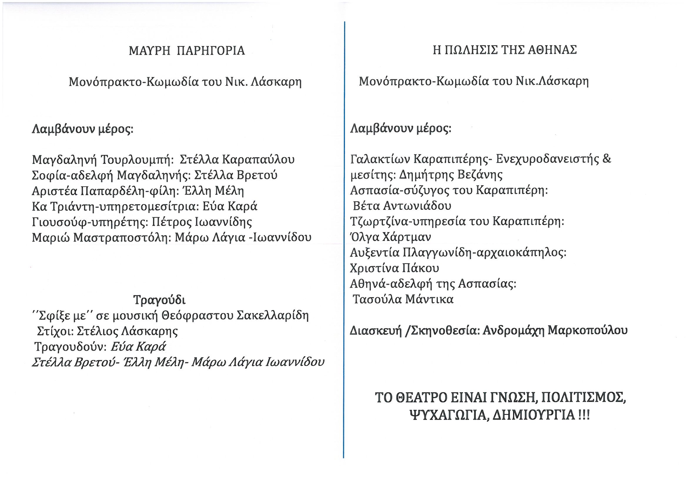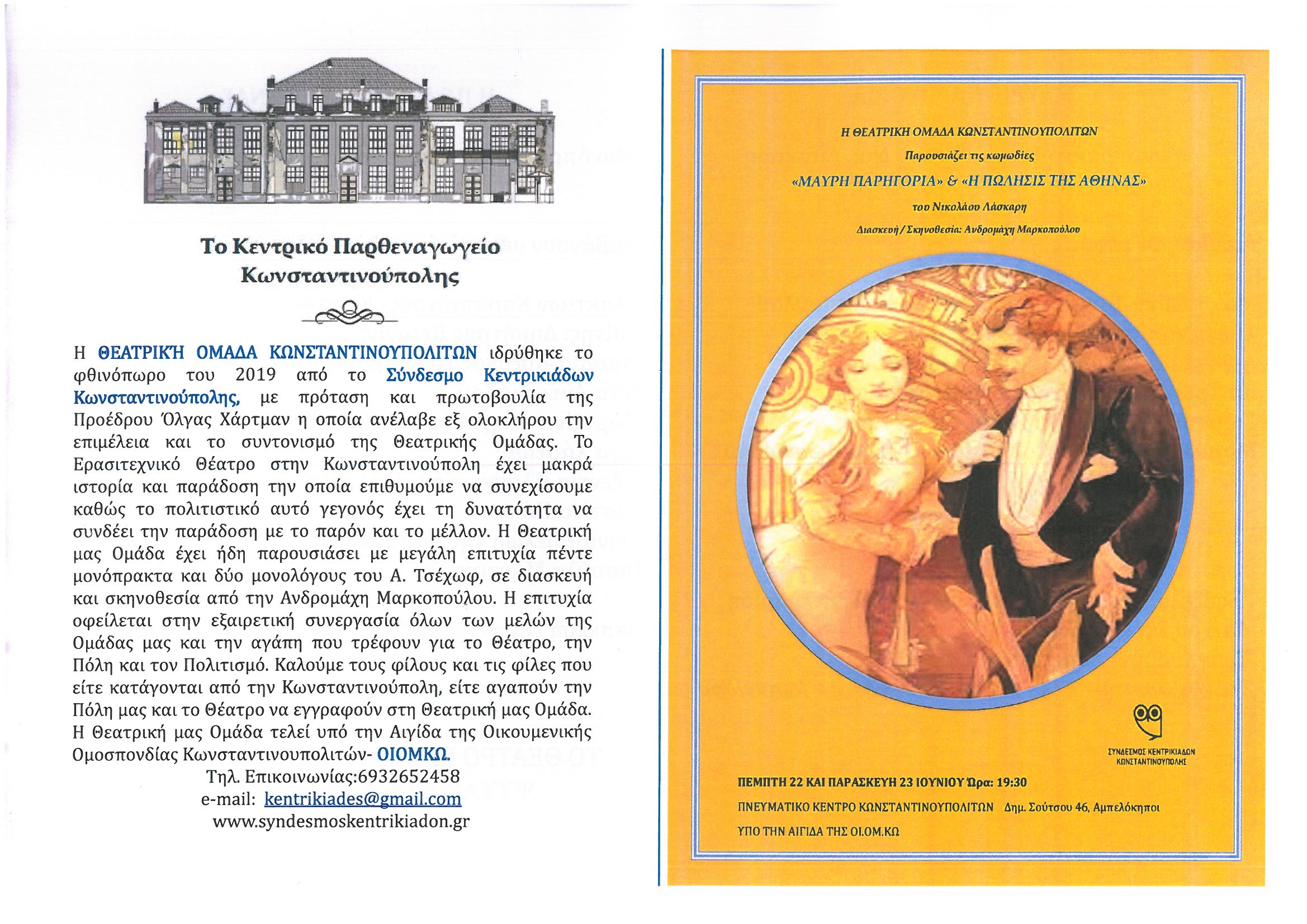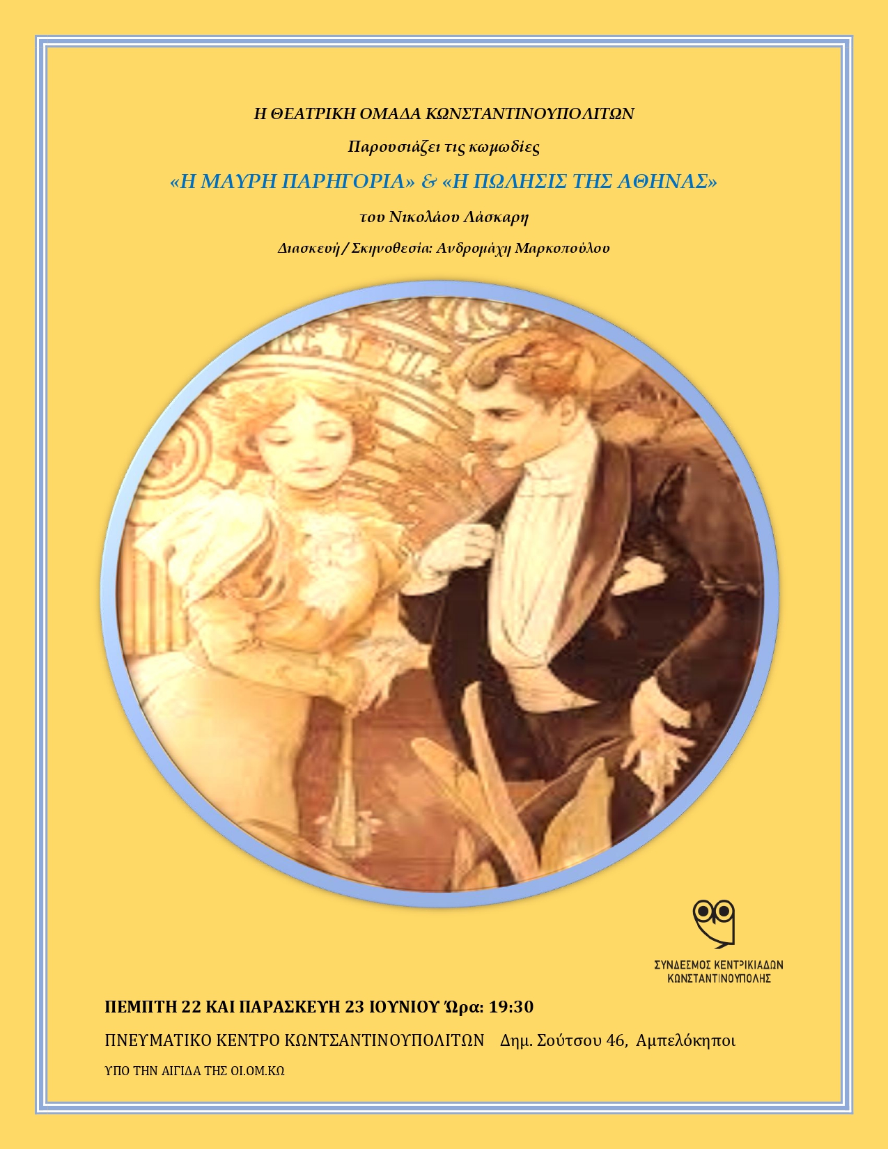 Την Πέμπτη 22 και την Παρασκευή 23 Ιουνίου 2023, στις 7:30 μ.μ. στο Πνευματικό Κέντρο Κωνσταντινουπολιτών (Δημ. Σούτσου 46, Αμπελόκηποι) παρακολουθήστε από τη Θεατρική Ομάδα Κωνσταντινουπολιτών τις κωμωδίες "Η Πώληση της Αθηνάς" και "Μαύρη Παρηγορία", του Νικολάου Λάσκαρη, σε σκηνοθεσία Ανδρομάχης Μαρκοπούλου.