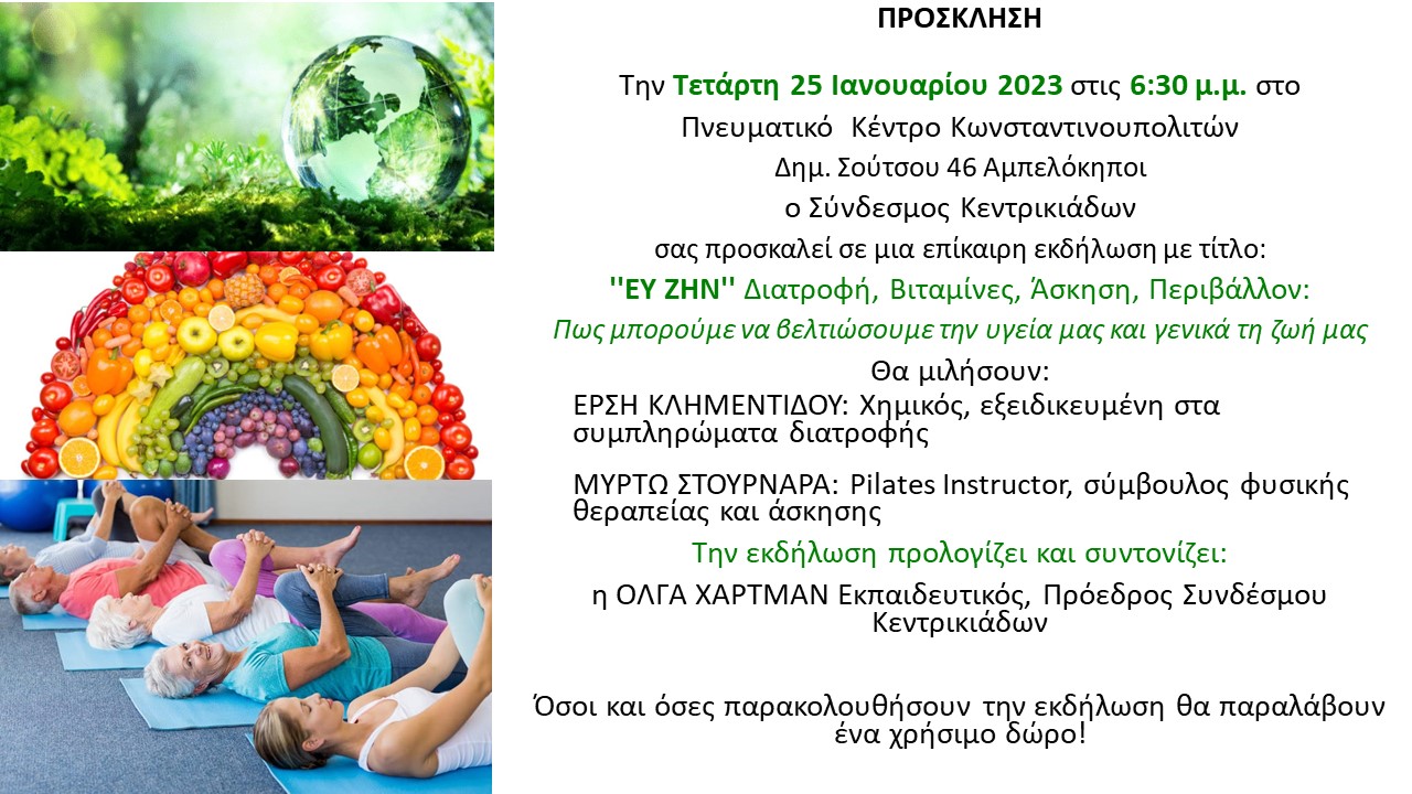 Ώρα 6:30 μ.μ. στο Πνευματικό Κέντρο Κωνσταντινουπολιτών. Προγραμματίζουμε μια ιδιαίτερα ενδιαφέρουσα εκδήλωση για την αναβάθμιση της υγείας μας και γενικά της ζωής μας με τίτλο «ΕΥ ΖΗΝ». Όλοι και όλες που θα συμμετέχουν στην εκδήλωση αυτή θα παραλάβουν ένα χρήσιμο δώρο. Σύντομα θα ανακοινώσουμε νεώτερα και λεπτομέρειες για τις εισηγήσεις.