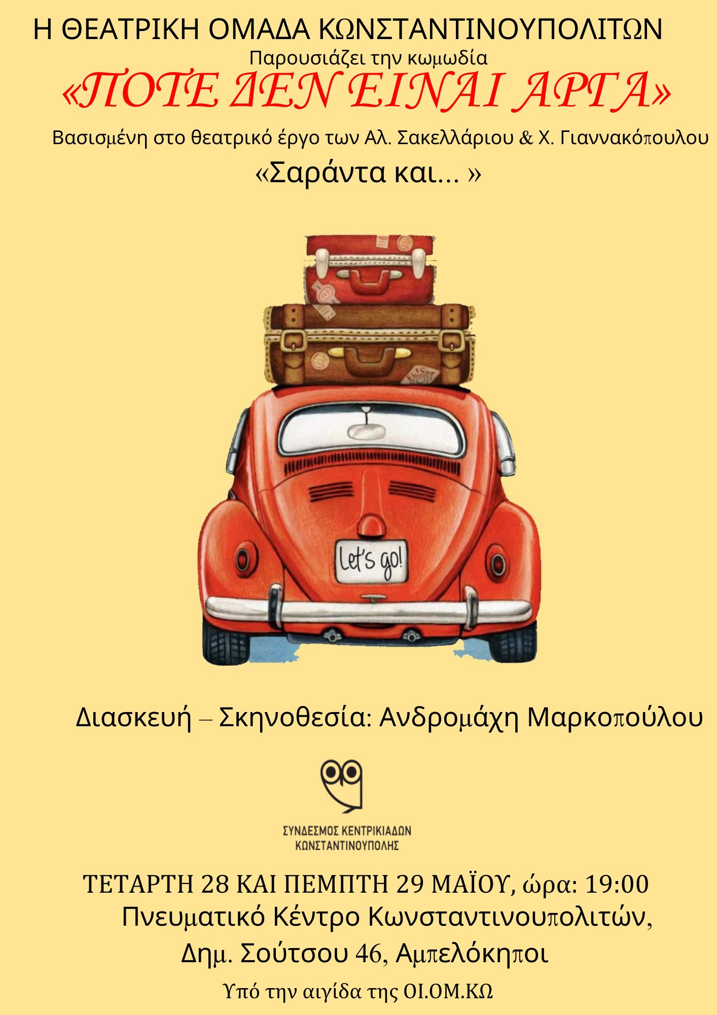 Ώρα 7:00 μ.μ. Θα σας περιμένουμε να απολαύσετε την ωραία παράσταση που θα ανεβάσει η Θεατρική μας Ομάδα με το έργο "ΠΟΤΕ ΔΕΝ ΕΙΝΑΙ ΑΡΓΑ" βασισμένο στο θεατρικό έργο "Σαράντα και …" των Αλ. Σακελλάριου και Χ. Γιαννακόπουλου σε Διασκευή Ανδρομάχης Μαρκοπούλου. Η παράσταση θα γίνει στο Πνευματικό Κέντρο Κωνσταντινουπολιτών ( Δημ. Σούτσου 46, στ.Μετρό Αμπελόκηποι).